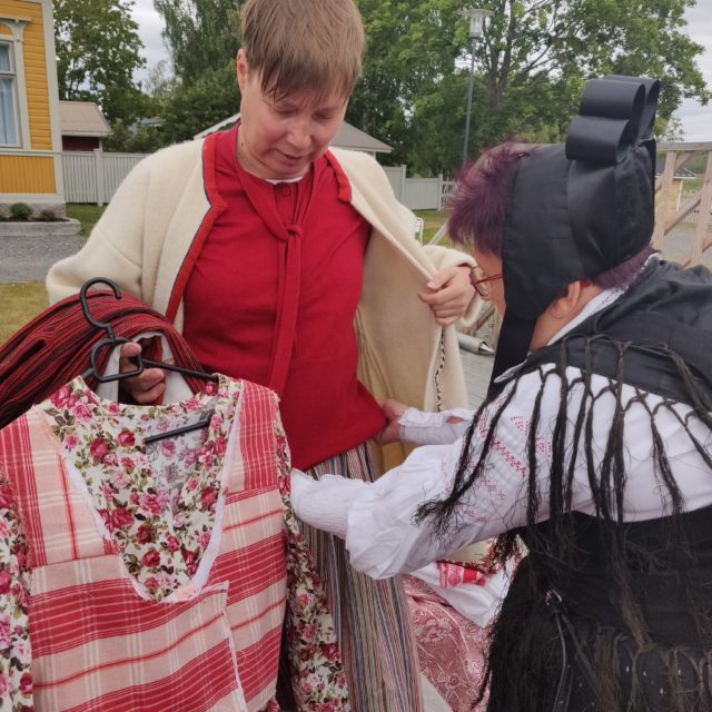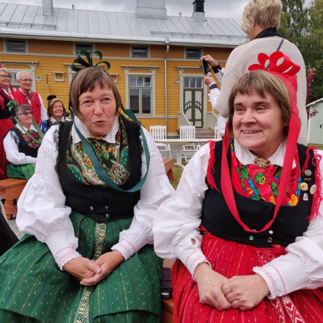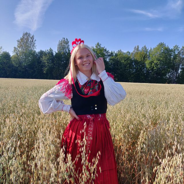 Klädseln för denna helg var såklart folkdräkten. Jag bar min egen folkdräkt som jag har haft under många tillställningar tidigare. Enligt mig borde folkdräkten användas oftare! Den röda dräkten som jag har på mig på bilderna är den så kallade “festdräkten”. Av Tjöck folkdräkten så finns det fem olika varianter för kvinnorna och endast en variant för männen. De olika färgerna på kvinnornas kjolar, sjalar och mössor är sen gammalt till för olika tillfällen. Den röda dräkten bars till fest, medan den blåa, gröna och svarta skulle användas i sorgetider. Det fanns även en speciell folkdräkt som skulle bäras när man gick i kyrkan. I den dräkten visade inte kvinnan sina broderade ärmar, och hon bar även en sjal på huvudet för att dölja sin mössa.