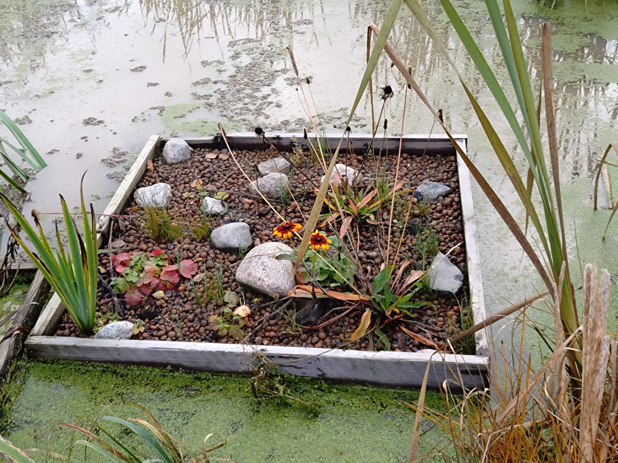 • En flytande konstruktion planterad med hydrofytiska växter.
