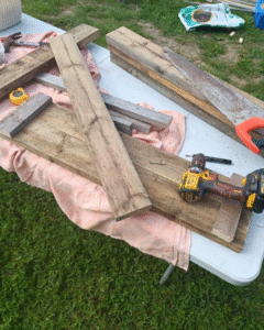 Delarna placeras så att mindre träbitar skapar plats att passa in den större brädan precis intill på två sidor, medan de andra två sidorna ger plats för den mindre biten. På så sätt får ramen stöd och allt passar ordentligt ihop.