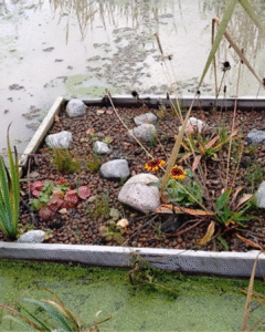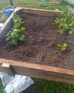 Tips! Det kan vara bra att lägga något över lecan tex hampnät eller fårull eller annat som håller lecan på plats men det är ändå enkelt att få ner växterna genom materialet. När det blåser hårt rör kan lecan röra på sig så mycket ett det nöter sönder rötterna, speciellt hård blåst direkt efter plantering. Samtidigt förhindras lecan att sköljas ur plattformen.