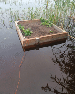 I denna guide bygger vi en flytande plattform av trä, metallnät, skruvar, häftstift, glasskum (foam glass) och lecakulor (Leca). För att få en hållbar konstruktion i vatten bör skruvar, metallnät, häftklamrar och andra metalldelar vara av rostfritt stål eller galvaniserat material. För trädelarna ger värmebehandlat trä längst hållbarhet. Gran anses ha bäst vattenresistens och tjockleken på brädorna påverkar livslängden – men använd det virke du har lättast tillgång till. Kanten på plattformen bör vara minst 20 cm högt för att den färdiga flytande våtmarken ska få plats med tillräckligt med skumglas till flytkraft och leca som substrat för växterna. Lecan kan täckas med tex säckväv eller hampanät för att hålla det på plats när det blåser. När vågorna blir höga sköljer de ut materialet ur plattformen.