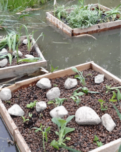 Syftet med substratet är att ge växterna stabilitet. Här används lecakulor (Leca) eftersom de är lättillgängliga och har låg vikt, men andra lösningar fungerar också.