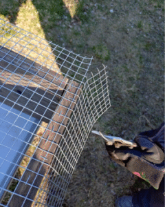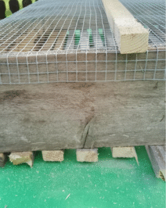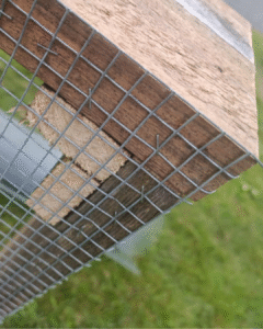 Nästa steg är att fästa metallnät på ramen, nätet ska utgöra botten på plattformen. Gör inte ramen bredare än det metallnät du har. Om nätet är 1 meter brett, bör ramen också vara max 1 meter bred så att du slipper skarva nät. Om nätet är bredare än kan du vika upp det på yttre sidan av ramen.