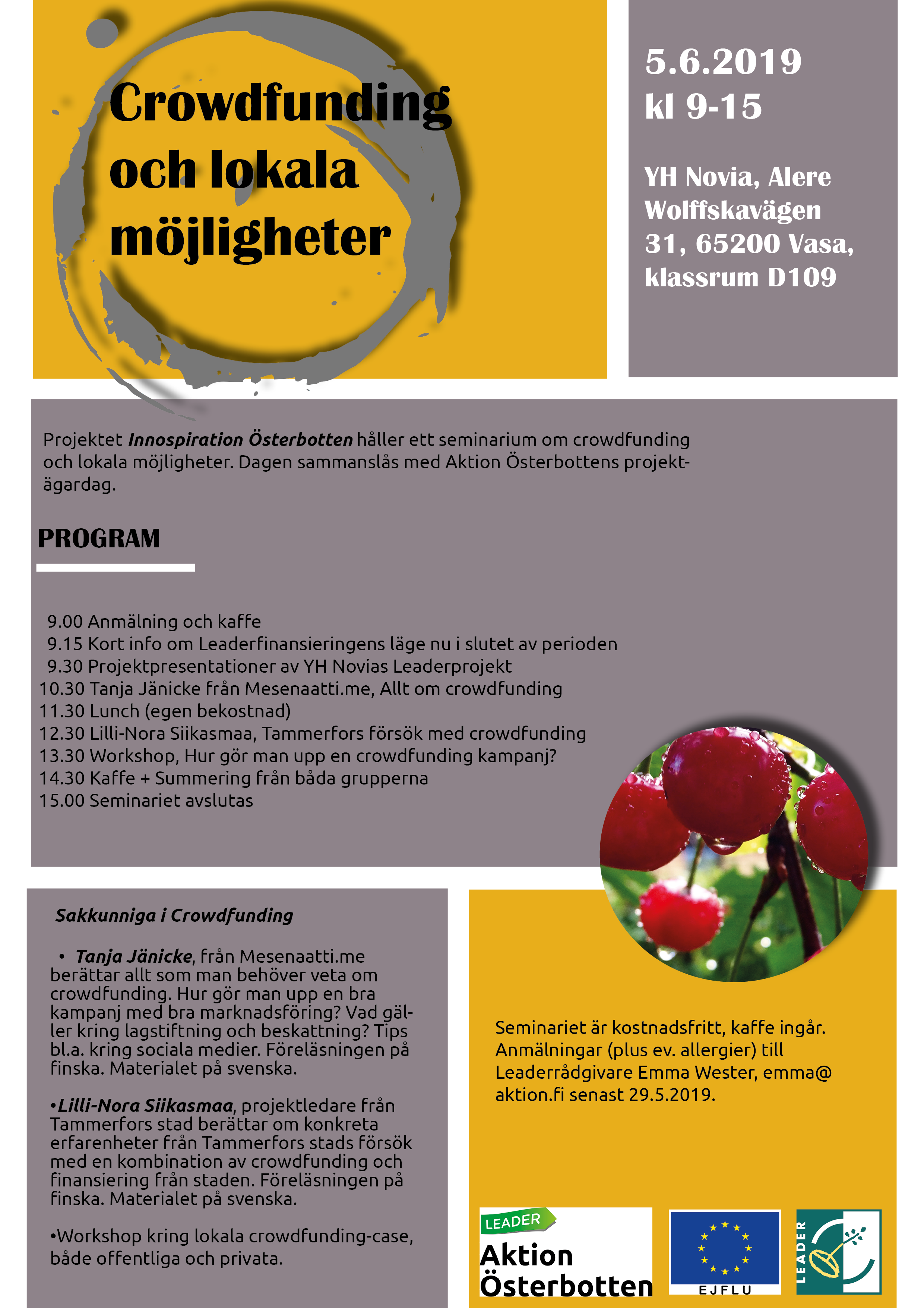 Innospiration Österbotten -hanke järjestää seminaarn joukkorahoituksesta ja sen paikallisista mahdollisuuksista. Päivä yhdistetään Aktion Österbottenin hankeomistajapäivään.