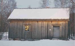- På utsidan finns brädbeslåning för att skydda stockarna, på taket finns trodor och näver ovanpå takfilten.