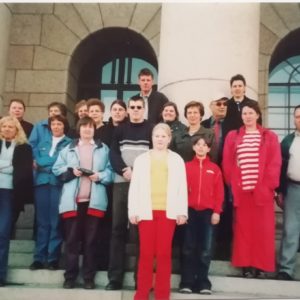 Byaföreningen har ordnat många resor i öst och väst och Åland har besökts. Här på kortet en resa till Helsingfors och deltagarna är samlade på riksdagshusets trappa.