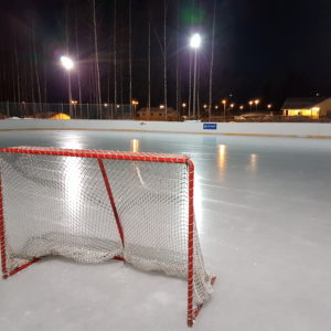 Hockeyrinken i Sandsund är välbesökt av byns barn och ungdomar. Daghemmet Hoppetossan syns i bakgrunden.