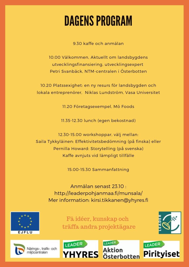 Projektet Lyhde III ordnar en nätverksdag i samarbete med NTM-centralen i Österbotten. Dagen är riktad till projket och företag som har fått finansiering från landsbygdsfond av Aktion Österbotten (eller av NTM-centralen i Österbotten, Leader Yhyres eller Leader Pirityiset).