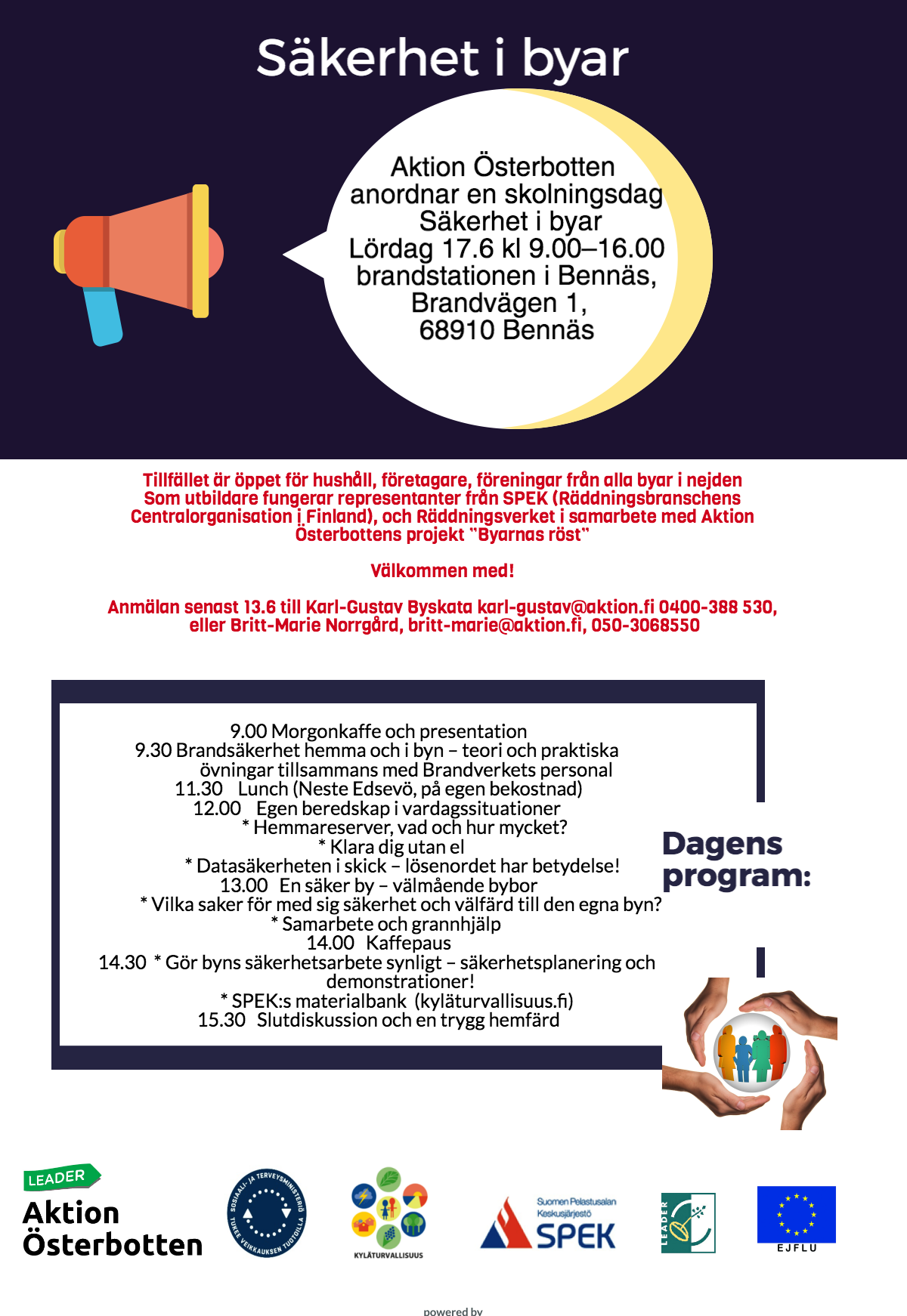 Byarnas röst anordnar en skolningsdag Säkerhet i byar lärdag den 17.6 kl 9.00–16.00 brandstationen i Bennäs.